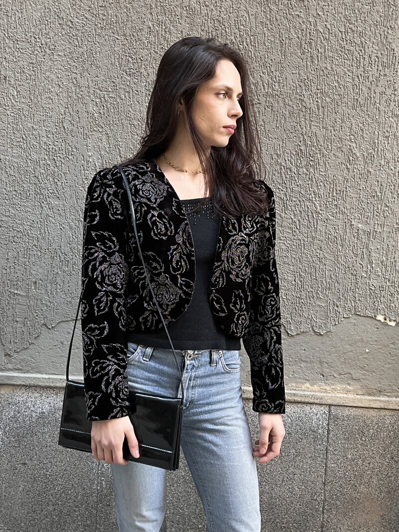 giacca in velluto nero ricamata jacquard con rose scintillanti